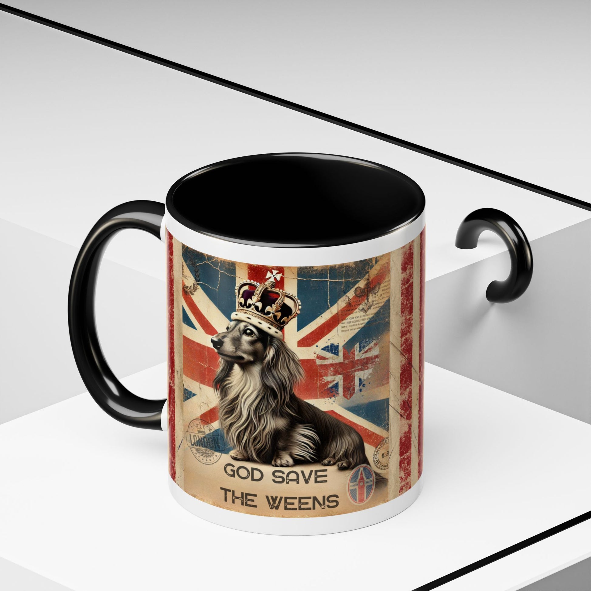 dachshund mug, royal dog mug, british dachshund gift, doxie mom mug, weenie dog tea mug, god save the weens, dog lover coffee mug, funny dog gifts, custom doxie mug, vintage union jack mug, british dog lover gift, dachshund queen mug, dog mom cup, weiner dog gift, British royalty, royal family, great britain,