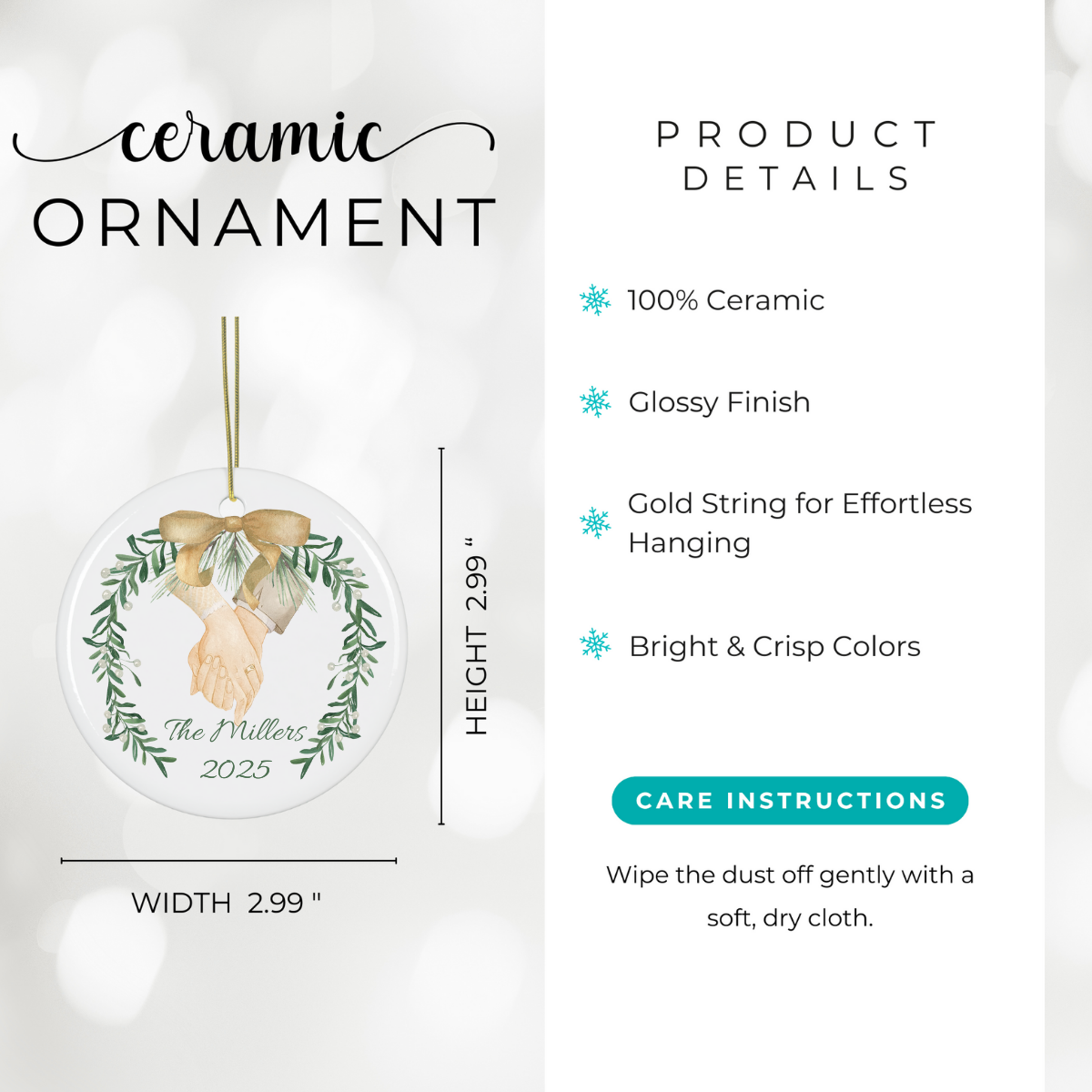 Celebrate love and new beginnings with this beautifully designed First Christmas Ornament, featuring a romantic watercolor illustration of two hands clasped together surrounded by a delicate winter wreath and topped with a golden bow. Personalized with the family name and the year, this ornament makes a heartfelt keepsake for newlyweds and engaged couples. Circle and Snowflake shapes available.