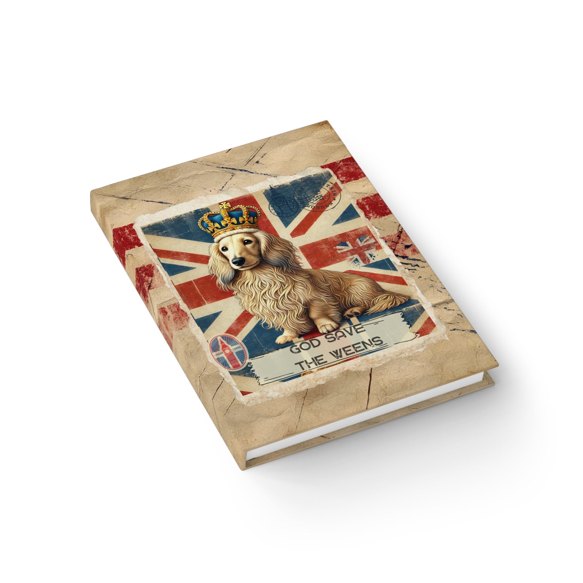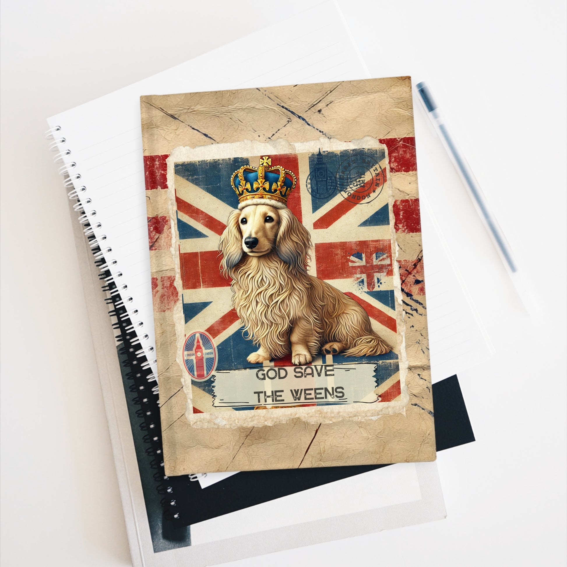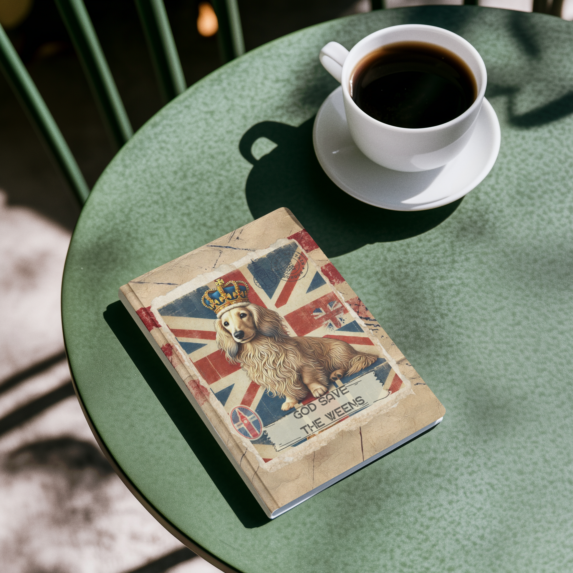 Celebrate your love for dachshunds with a royal twist! This “God Save the Weens” lined journal features an adorable crowned dachshund against a vintage Union Jack backdrop — a playful nod to British charm and weenie dog pride. Perfect for jotting down thoughts, dreams, or daily notes, this premium notebook combines style, humor, and personality.